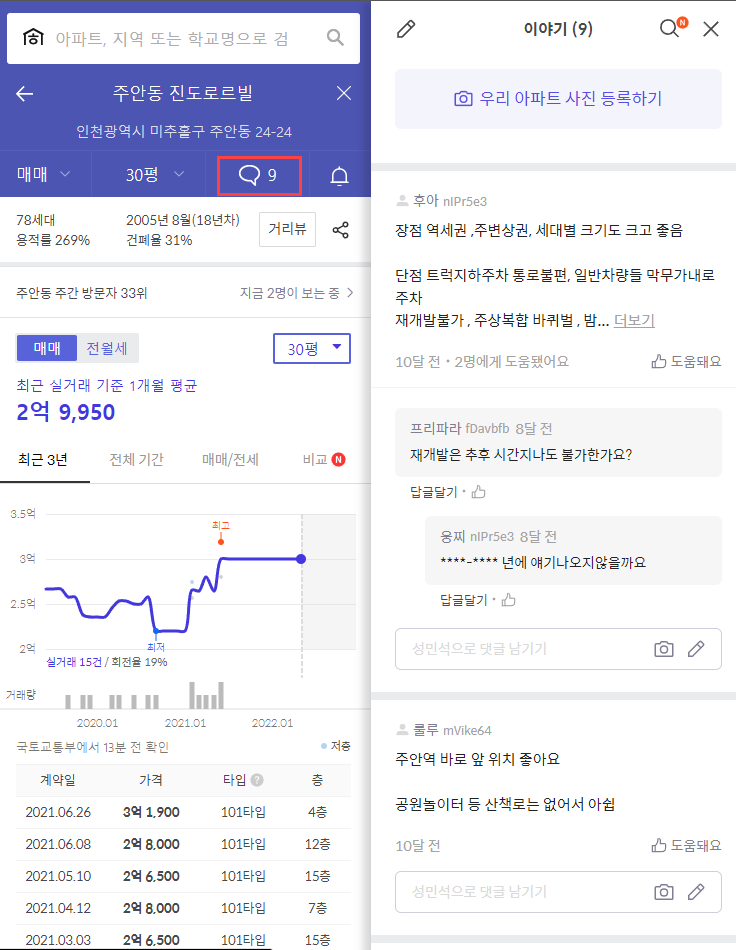2. 말풍선 버튼을 클릭하면 거주민들의 리뷰를 확인할 수 있습니다.