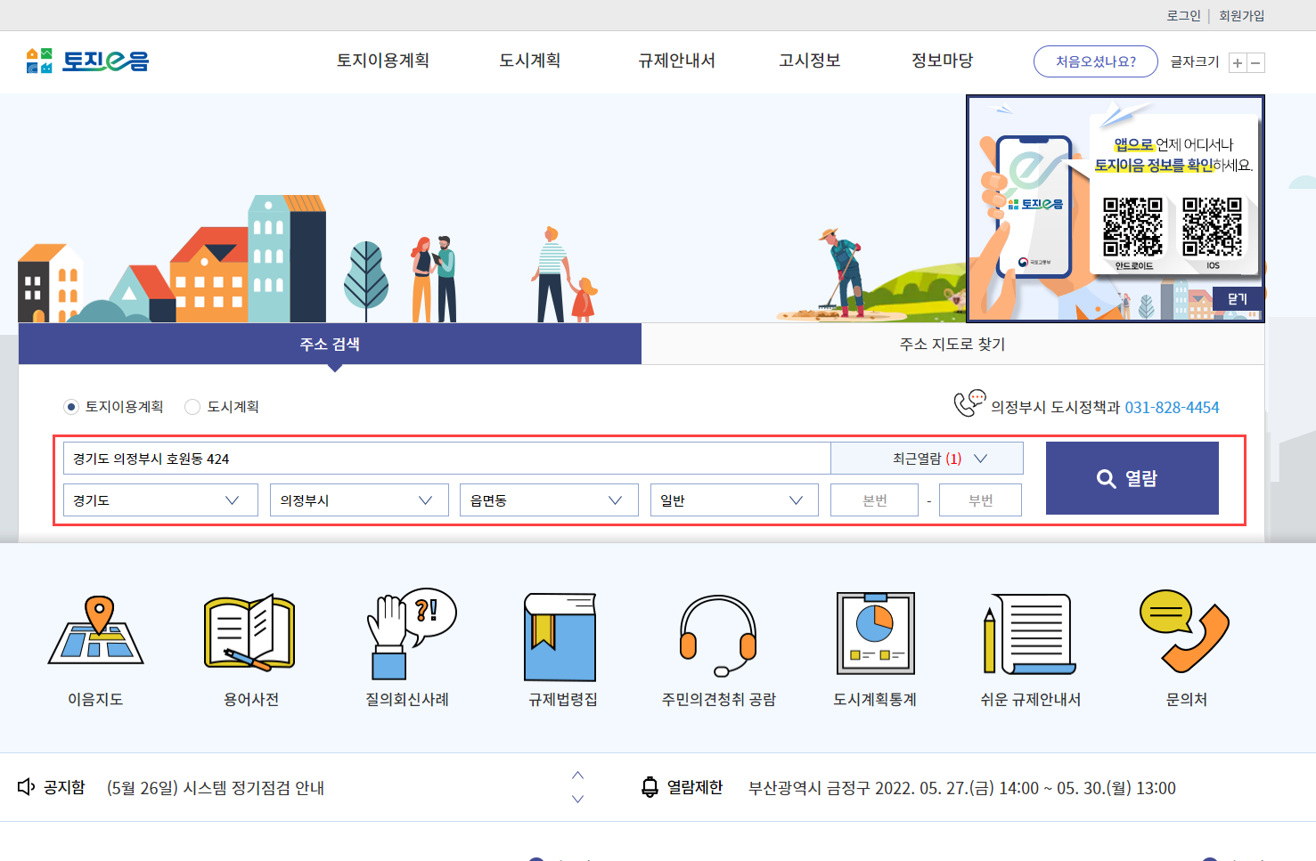 2. 해당 사이트에서 내가 분석하고자 하는 아파트의 주소를 입력하여 토지이용계획을 열람합니다.