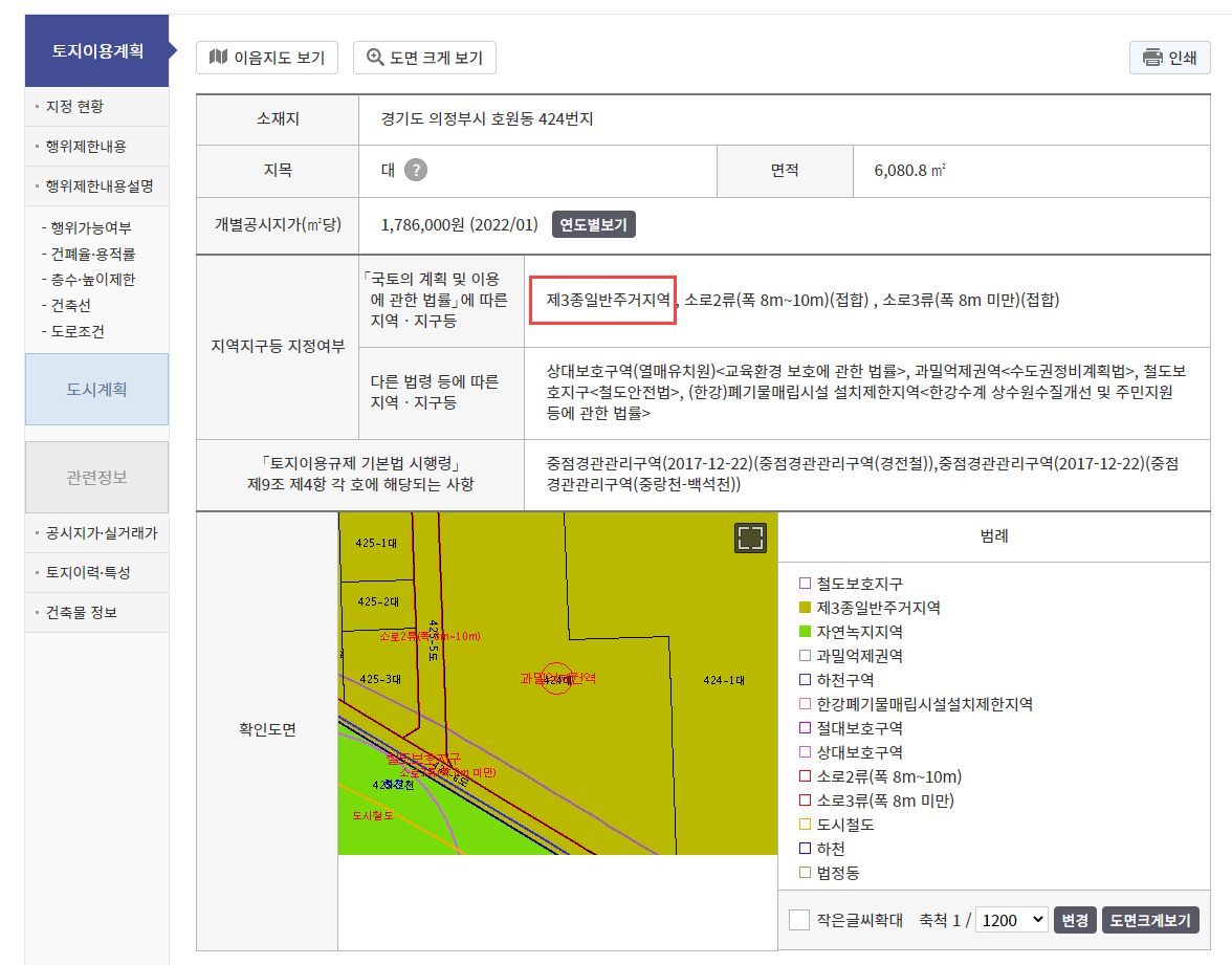 3. "「국토의 계획 및 이용에 관한 법률」에 따른 지역ㆍ지구등"에서 현재 토지의 용도를 확인할 수 있습니다.