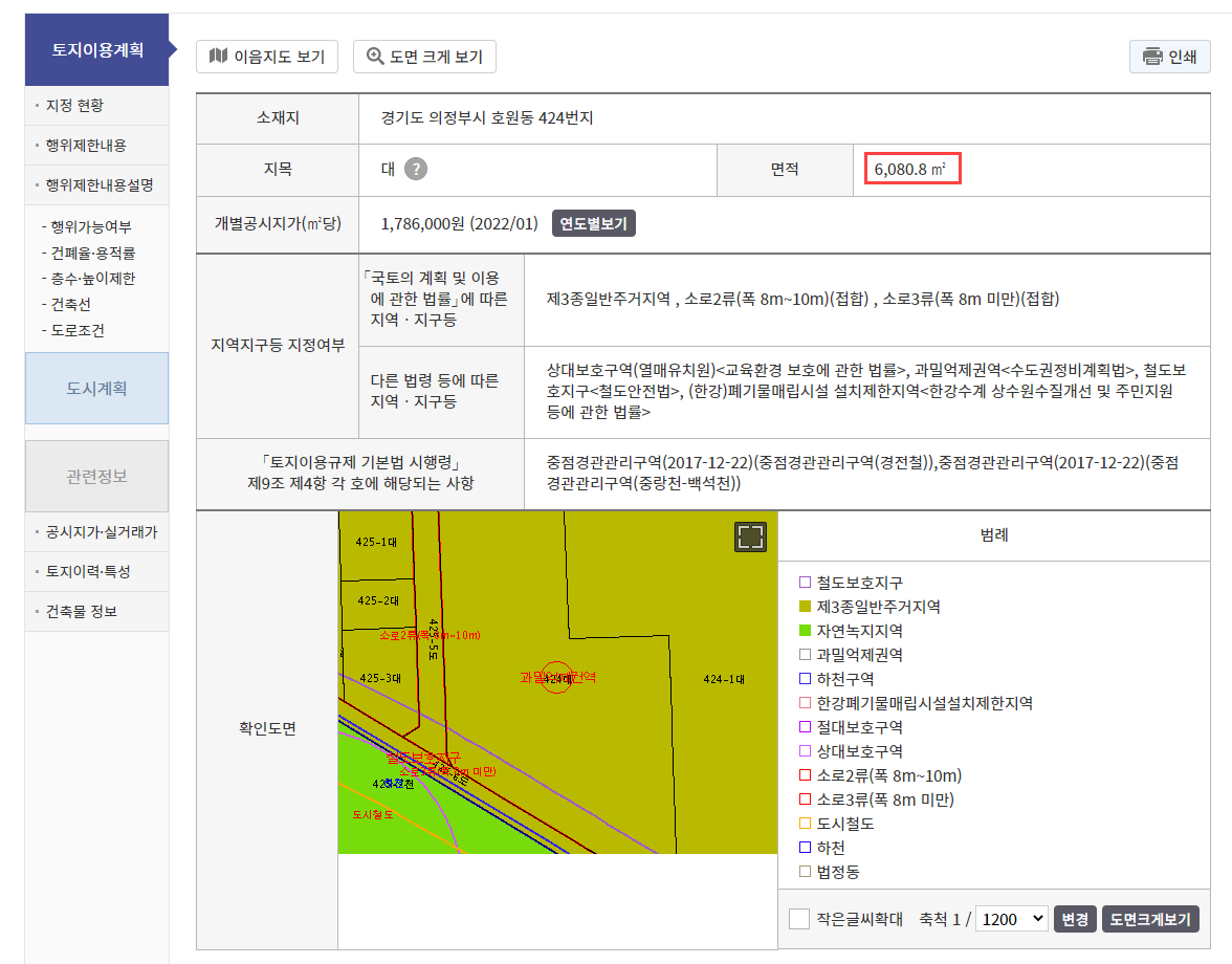 6. 다시 토지이용계획으로 돌아와서 현재 토지의 면적을 확인합니다.