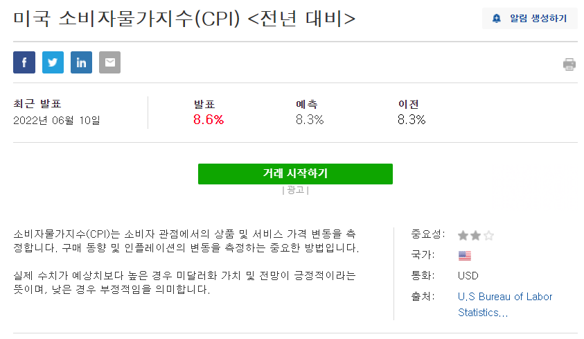 미국의 소비자물가지수를 뜻하는 CPI가 6월 10일에 발표되었는데 전년 동기 대비 8.6% 증가한 것으로 나타났습니다. 이는 기존 예측치인 8.3%보다 0.3% 큰 수치입니다.