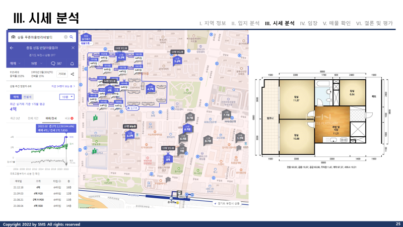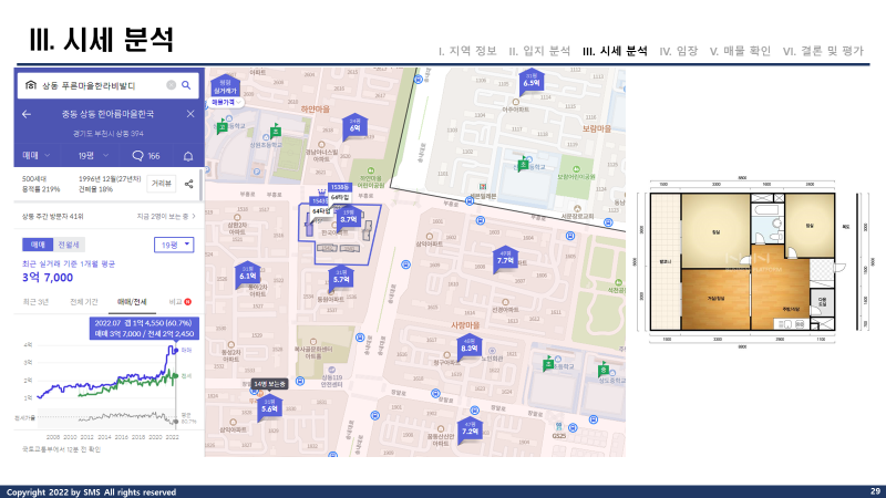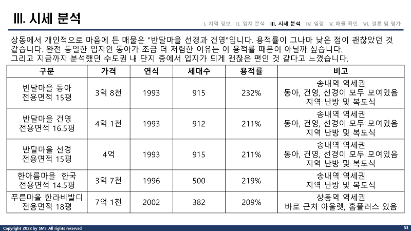 기존에는 무조건 방3을 기준으로 보고 있었는데요. 상동의 경우 거실을 포함해야만 방3 화1이었지만, 입지와 가격 모두 괜찮아보여서 손품 분석을 진행하게 되었습니다.