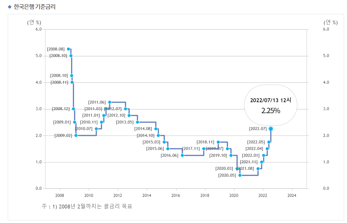 22년 7월 13일부로 한국 은행에서 기준 금리를 50bp(0.5%) 인상한 2.25%로 결정하였습니다.