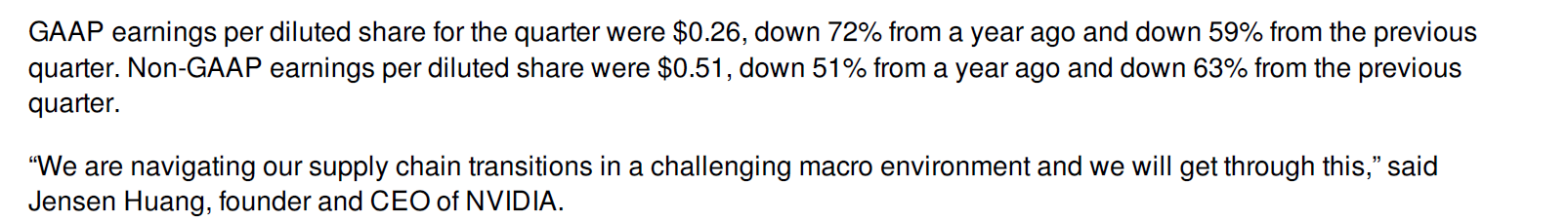 NVIDIA의 CEO인 JENSEN HUANG은 이에 대하여 현재 거시적 경제 환경 악화와 공급망 혼란이라는 상황에 직면해 있으며, 이를 극복하기 위해 최선을 노력을 하고 있다라고 언급 했습니다.