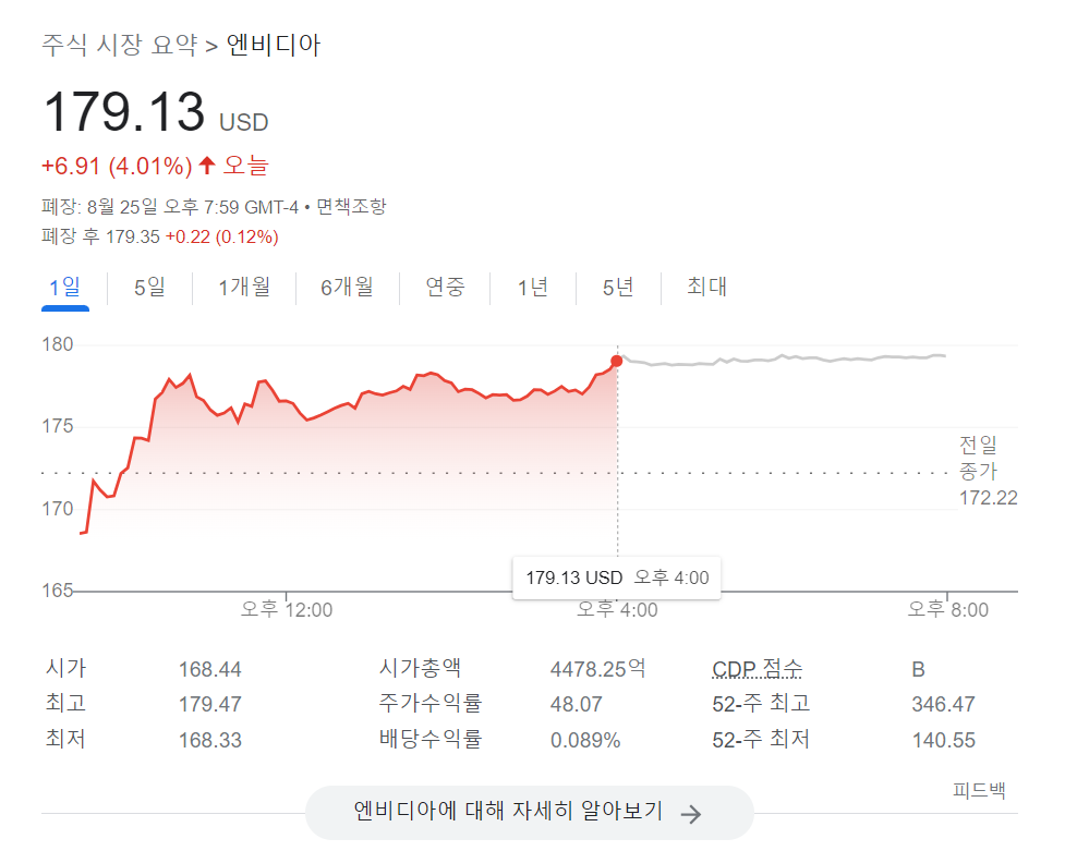 저는 개인적으로 이번 실적 발표 이후, NVIDIA의 주가가 크게 하락할 것이라고 생각했는데... 오히려 4%나 상승을 했습니다. 어떻게 된 일인지 확인을 해봐야 할 것 같습니다.