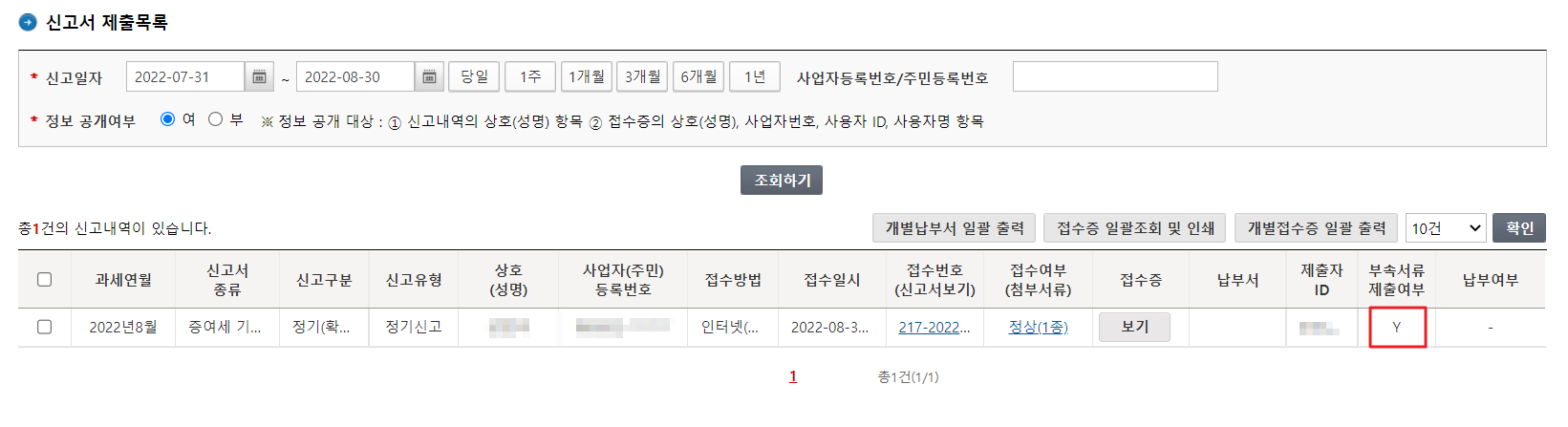 11. 이후 "신고/납부 -> 증여세 > 신고내역 조회" 메뉴에서 부속서류의 제출 여부를 확인할 수 있습니다.