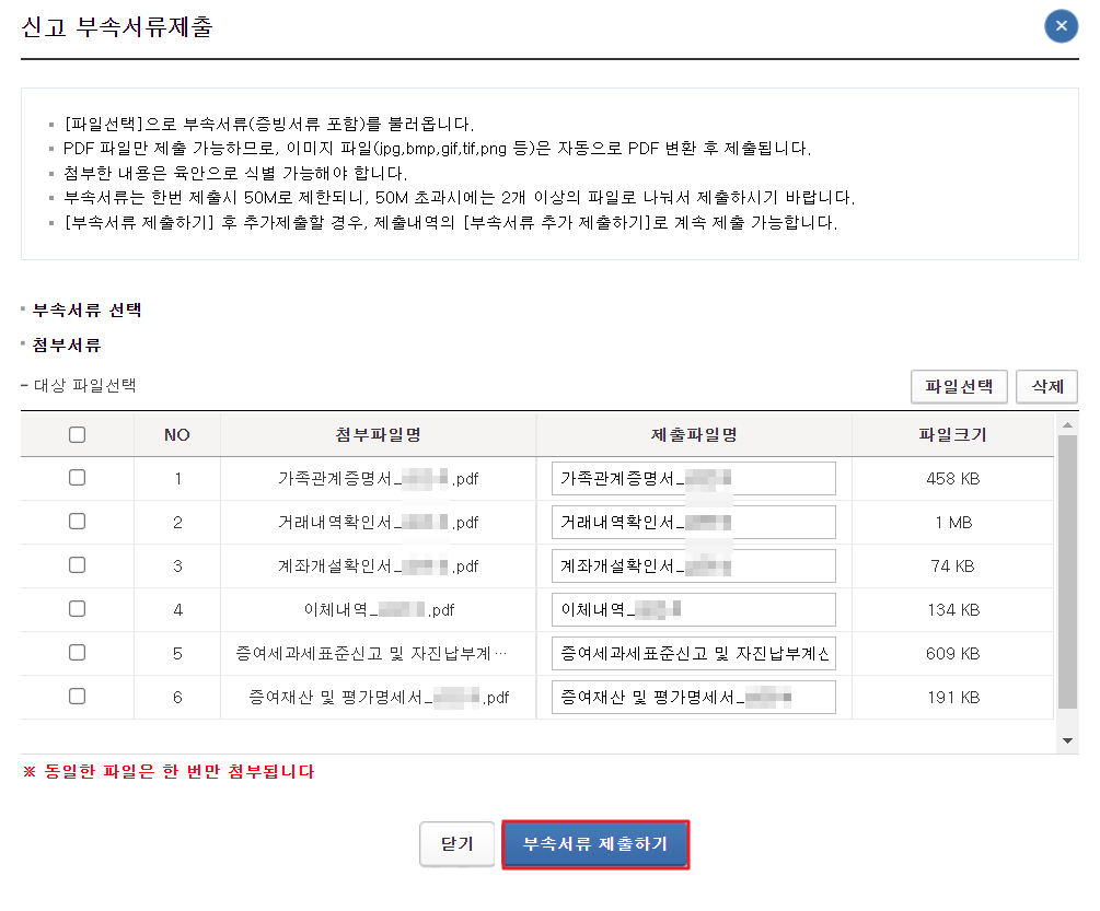 10. 그리고 사전에 준비한 부속서류를 제출합니다.