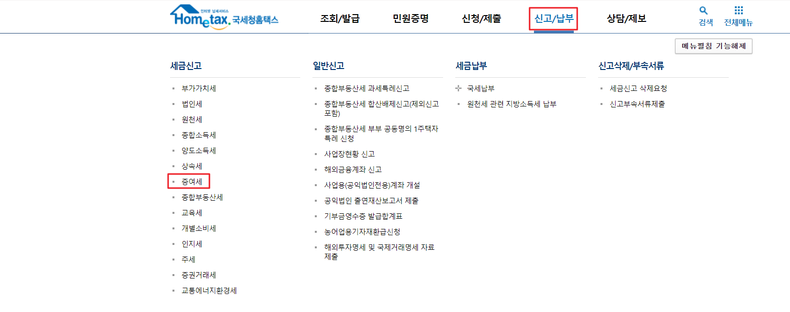 1. 먼저 홈택스에 로그인한 뒤 "신고/납부 -> 증여세" 메뉴를 클릭합니다.