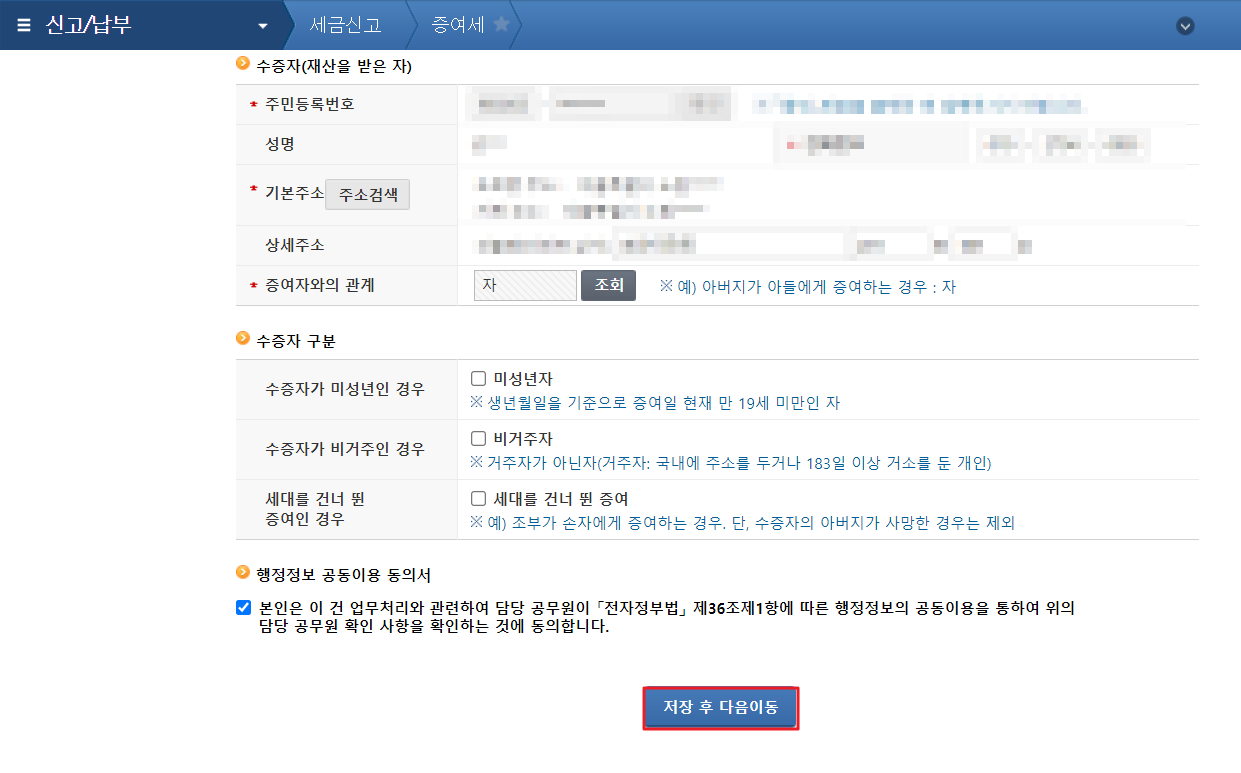 3. 증여자(재산을 주는 사람)와 수증자(재산을 받는 사람)에 대한 내용을 기입 후 "저장 후 다음이동" 버튼을 클릭합니다.