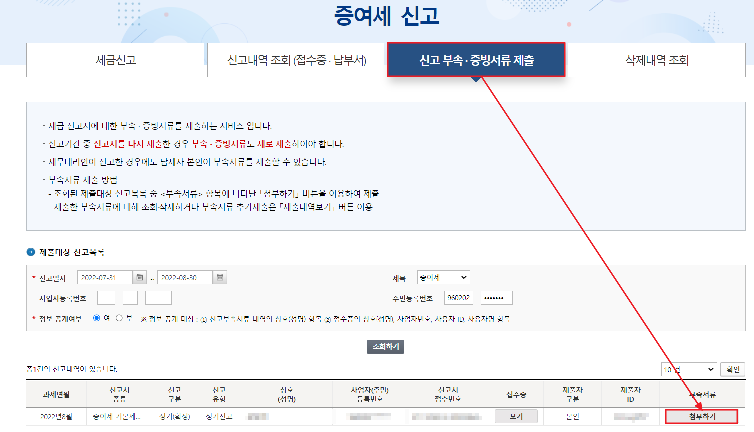 9. 그리고 신고를 위해 필요한 나머지 서류들도 준비한 뒤, "신고/납부 -> 증여세 > 신고 부속.증빙서류 제출" 메뉴에서 "조회하기"와 "첨부하기" 버튼을 클릭합니다.