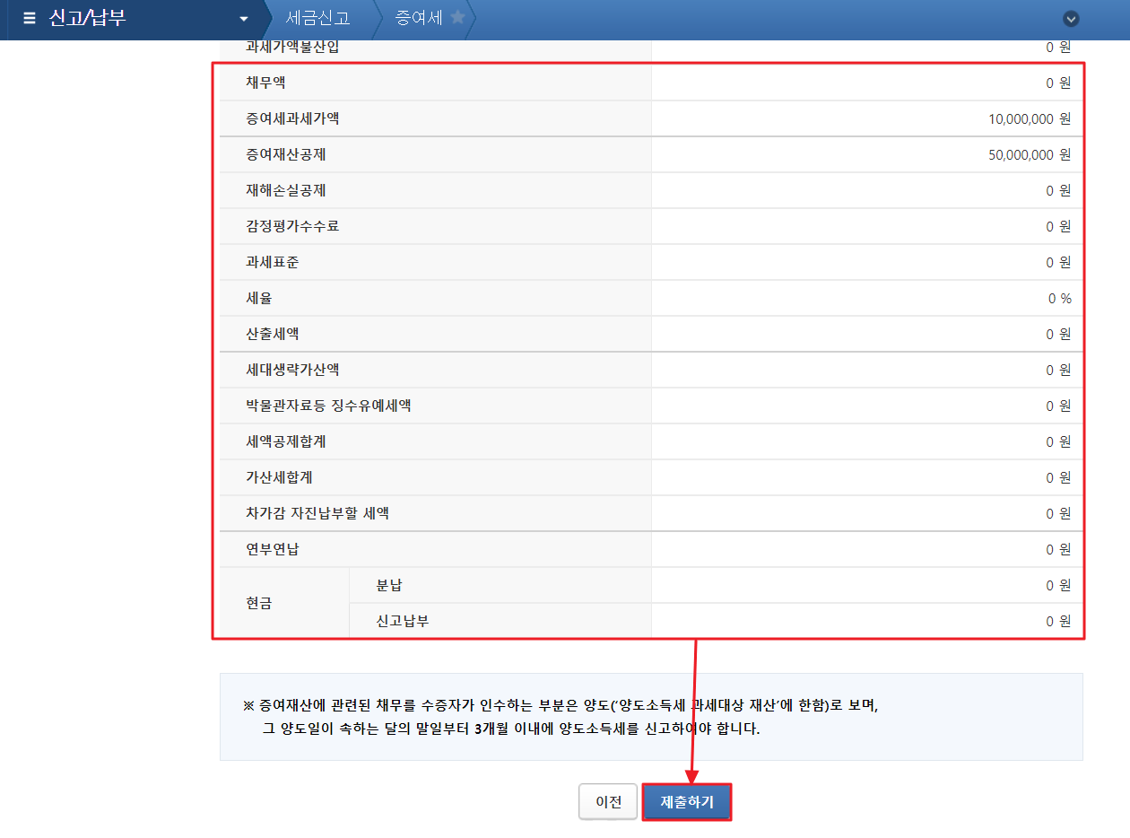 6. 정상적으로 신고 내역이 입력되었는지 확인한 뒤, "제출하기" 버튼을 클릭합니다.