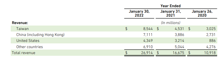 중국에 대한 수출 규제가 NVIDIA에 얼마나 큰 타격을 줄 수 있는지 알아보기 위해 NVIDIA의 중국(홍콩 포함) 매출 비율을 확인했습니다.