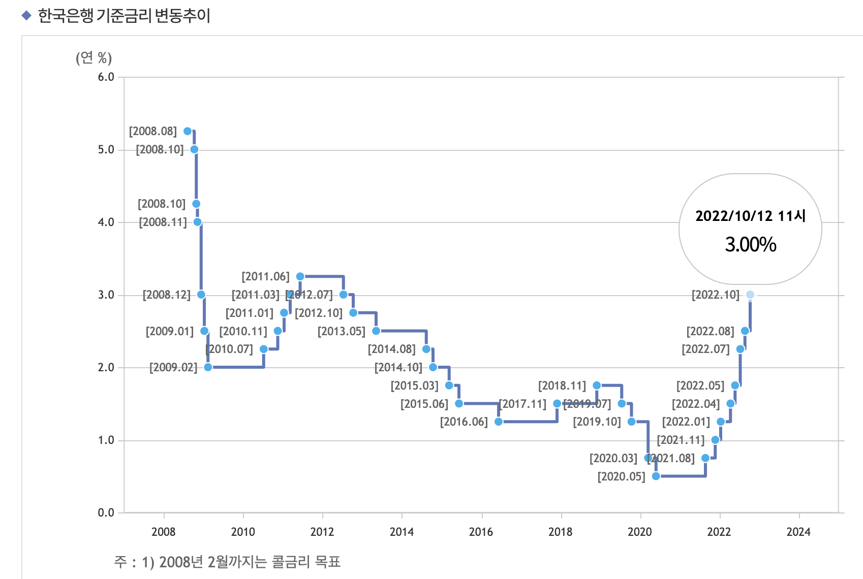 22년 10월 12일부로 한국 은행에서 기준 금리를 50bp(0.50%) 인상한 3.00%로 결정하였습니다. 2012년 10월 이후 10년만에 3%대 기준 금리를 맞게 되었습니다.