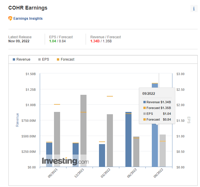 이번에 Coherent (COHR)에서 실적을 발표한 뒤, 주가가 7.55% 정도 상승을 했는데요. 장을 시작한 기준으로 15% 넘게 상승을 했을 정도로 좋은 실적을 발표한 것으로 보입니다. (심지어 미국 장은 하락장..!)