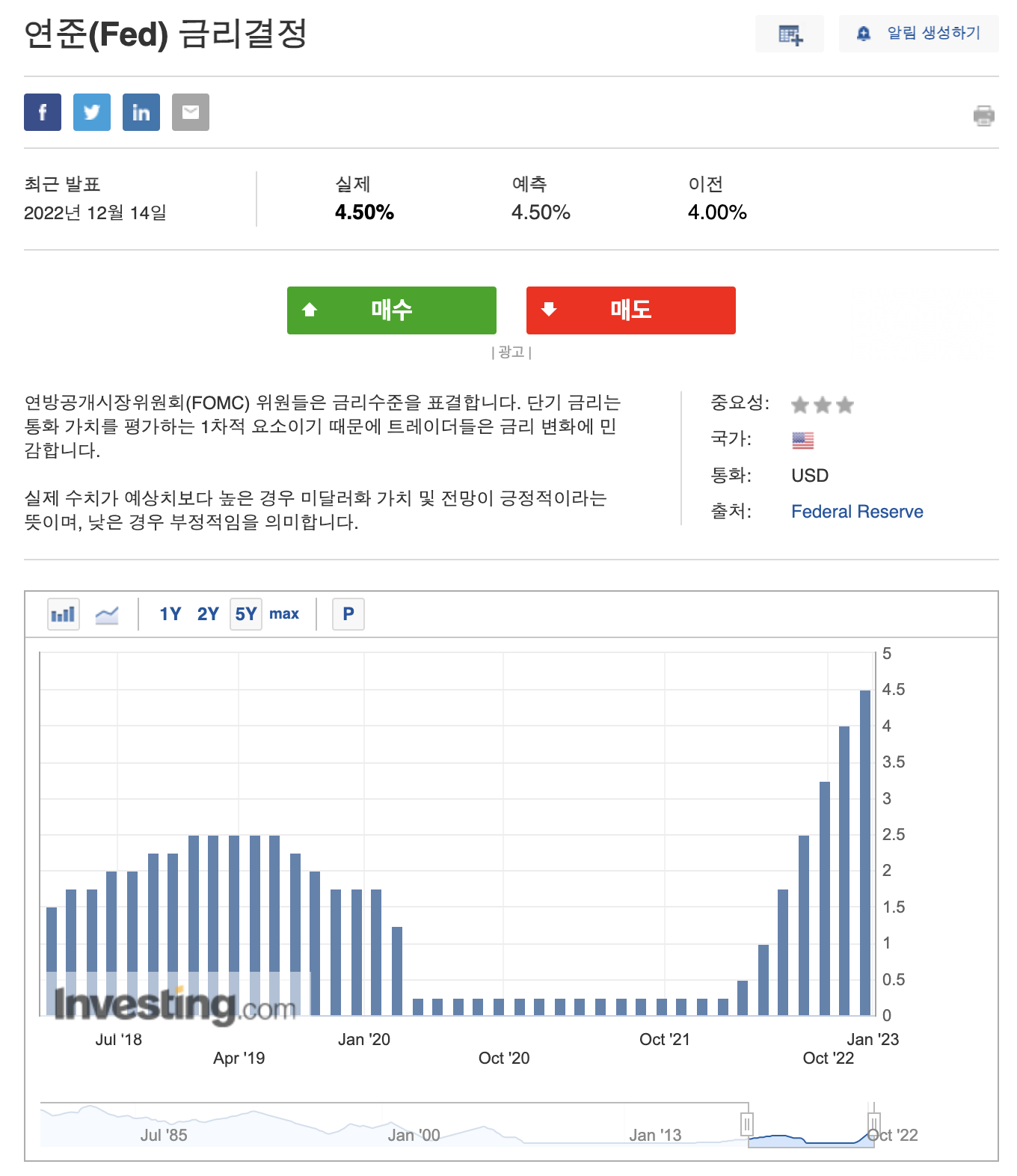 이번 0.5% 상승으로 미국 연준 금리는 4.0%->4.5%로 상승을 하였습니다.
