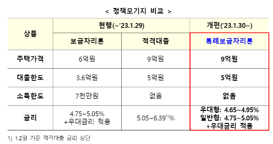 주요 내용 □ `23.1.30.(월)부터 기존의 보금자리론에 일반형 안심전환대출, 적격대출을 통합한 특례보금자리론을 1년간 한시 운영합니다. ㅇ 대상 주택가격이 9억원 이하인 차주가, 소득제한 없이