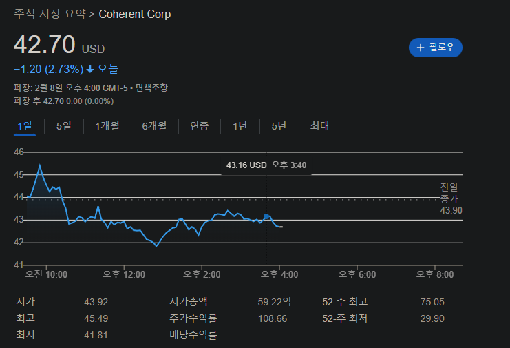 이번에 Coherent (COHR)에서 실적을 발표했는데요. 아직 장이 시작하지 않았기 때문에 시장의 반응은 확인하지 못했습니다. 내일 시장의 반응을 추가하도록 하겠습니다.