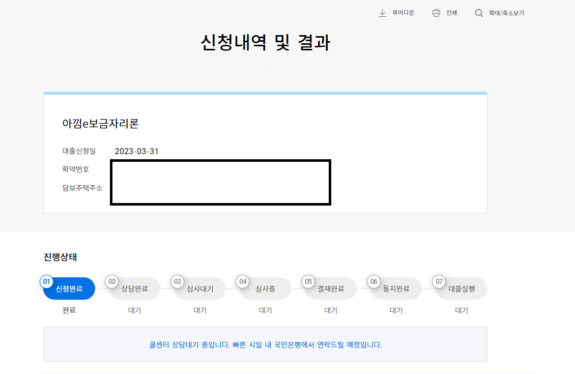 16. 이제 신청이 마무리 되었다면, MY HF -> 주택담보대출 -> 신청 내역 조회 에서 아래와 같은 화면을 보실 수 있을 겁니다!