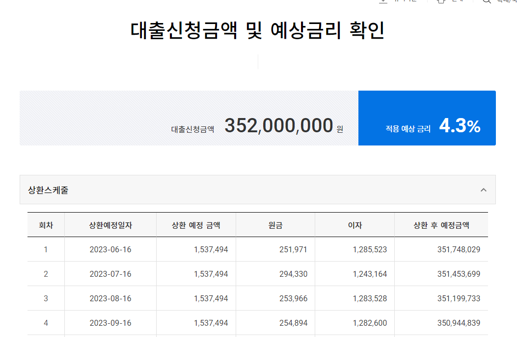 14. 다시 대출가능여부 확인 버튼을 클릭하였을 때 아래와 같이 대출신청금액 및 예상금리 확인 화면이 나왔다면, 대출이 정상적으로 가능하다고 판단하시면 될 것 같습니다.