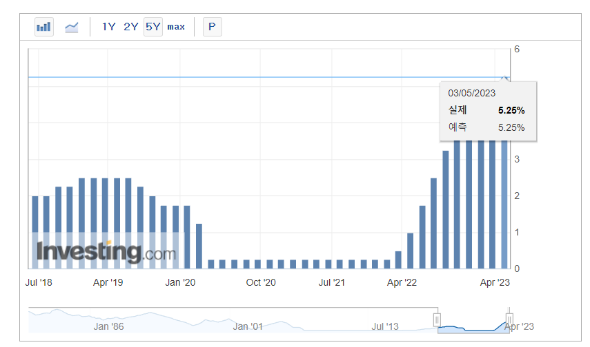 이에 따라 미국의 기준 금리는 5%에서 5.25%로 상승했습니다.