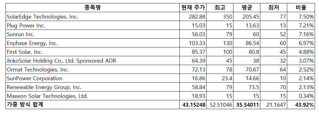 목표주가가 있는 10개의 기업(43.92%)들을 가중 방식으로 합산을 해보면 현재 주가는 43.15달러, 평균 목표 주가는 35.54달러로 평균 목표 주가보다 비싸게 현재 주가가 형성되어 있다.