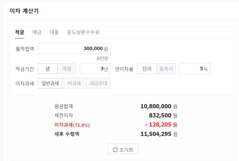 정답에 앞서 적금, 예금 상품의 만기 이자를 계산하는 방법을 알려드리자면, 네이버에서 이자 계산기라고 검색을 하신 뒤, 각 상품에 맞는 내용을 입력하시면 편하게 확인하실 수 있습니다.
