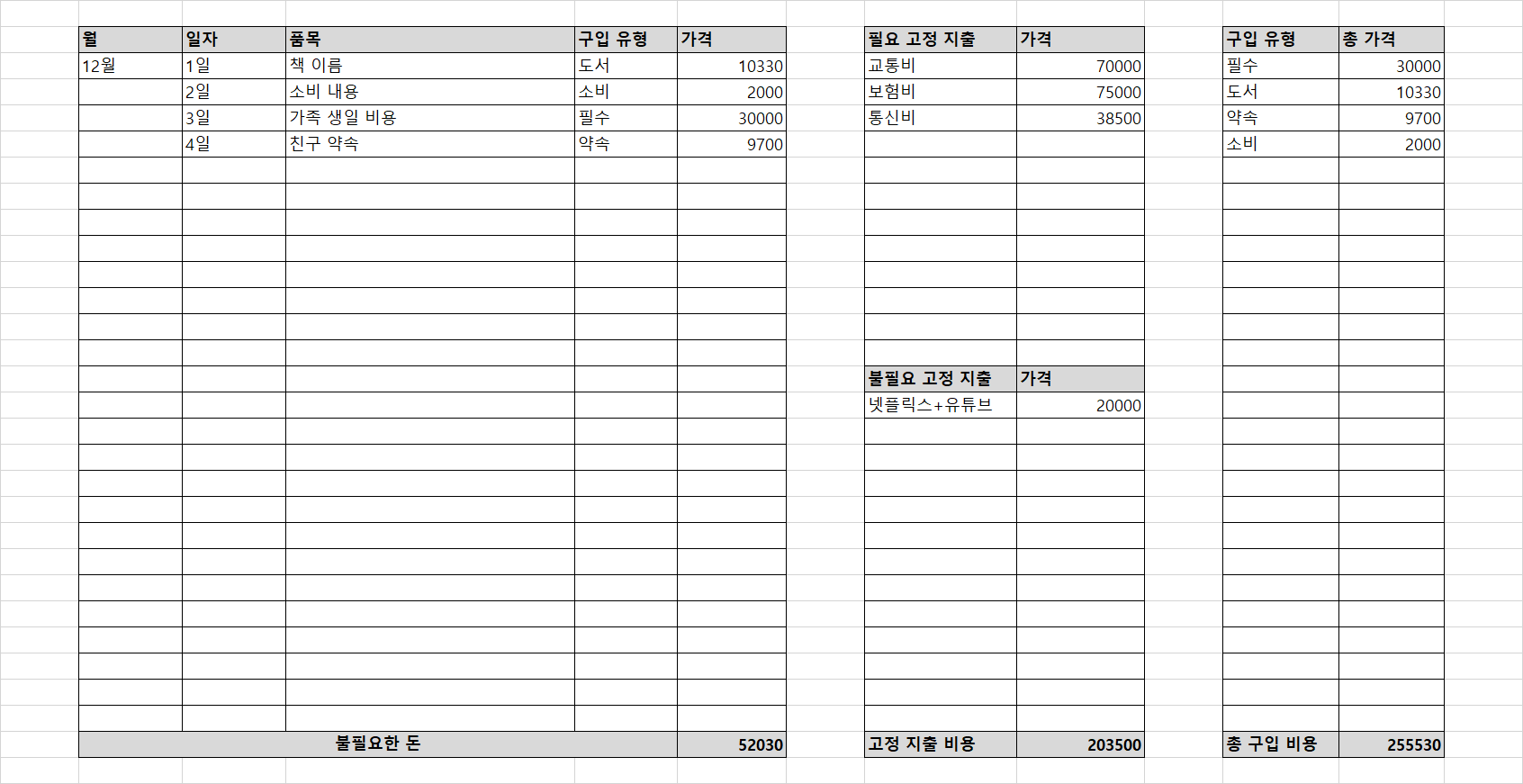 | 쇼핑 | 100만원 | 비고정 지출 |