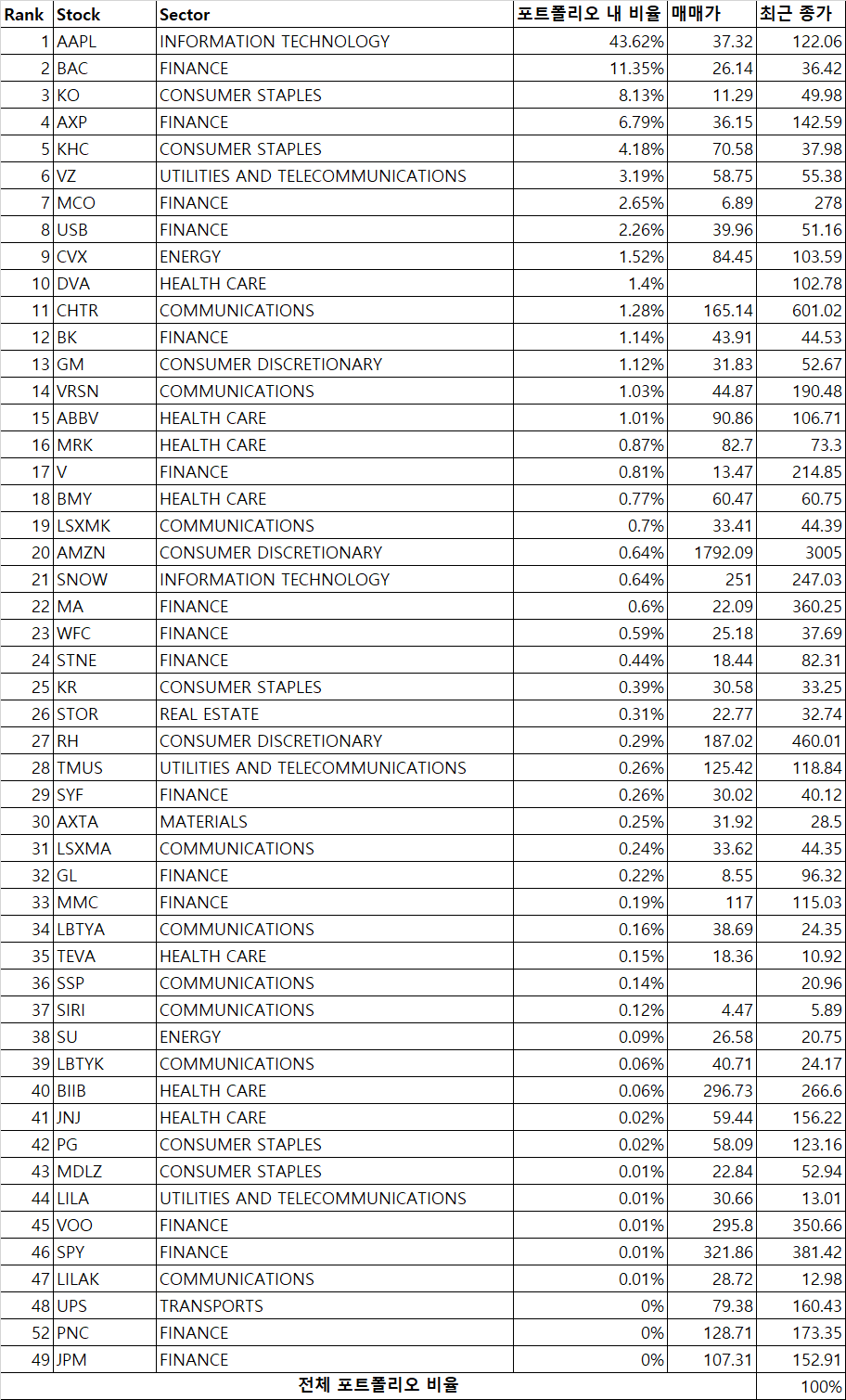 투자 포트폴리오 (20년 12월 31일, 13-F 기준)
