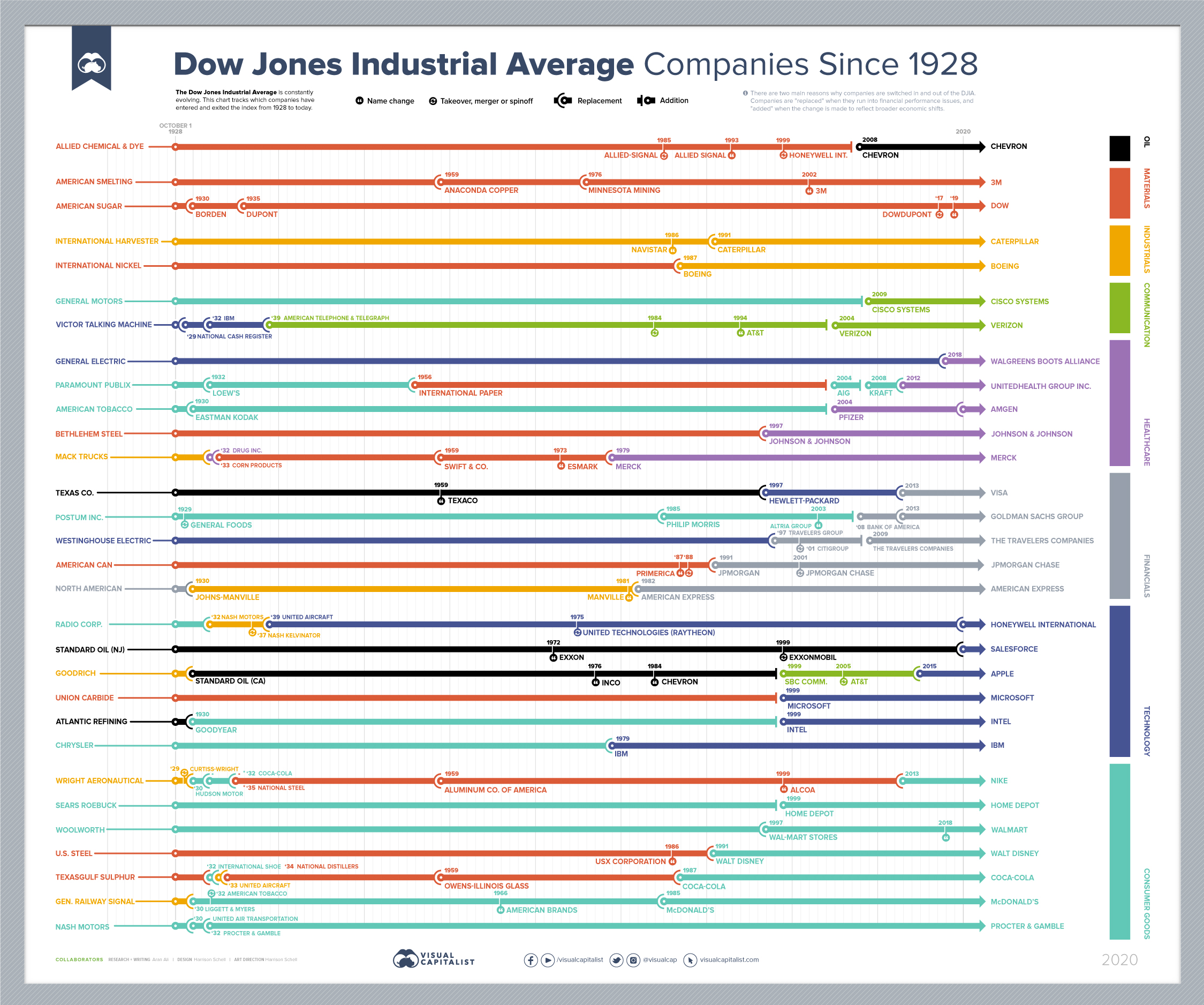 1884년 다우 운송 지수가 세상의 첫 지수였고 1896년 12개로 다우 지수가 탄생했으며, 이때 첫 날 지수는 40.94였다. 1928년 30개로 확대되었으며, 연평균 7.69% 상승하면서 40.94에서 34,323까지 지수가 상승했다.