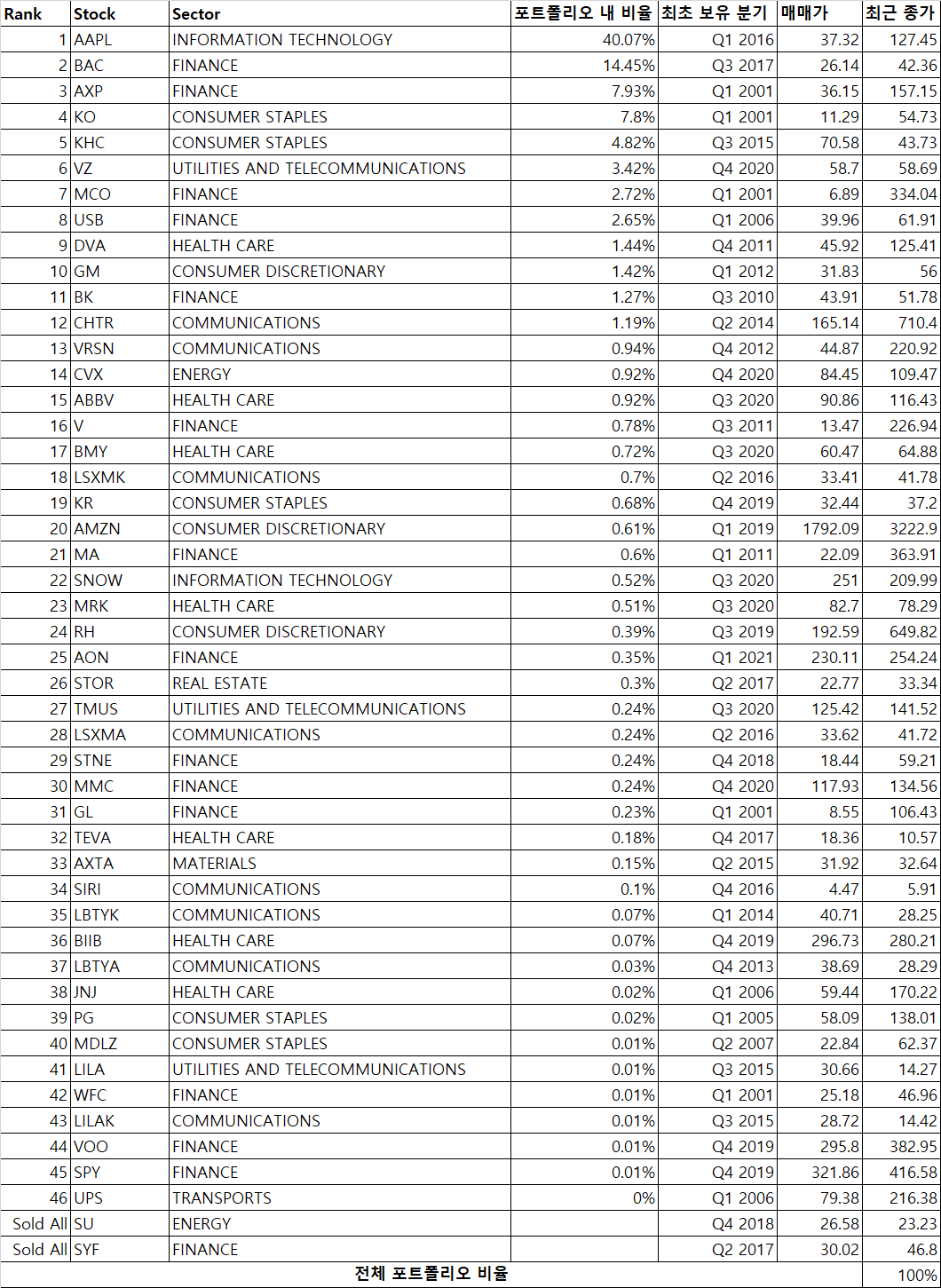 투자 포트폴리오 (21년 03월 31일, 13-F 기준) <추가>