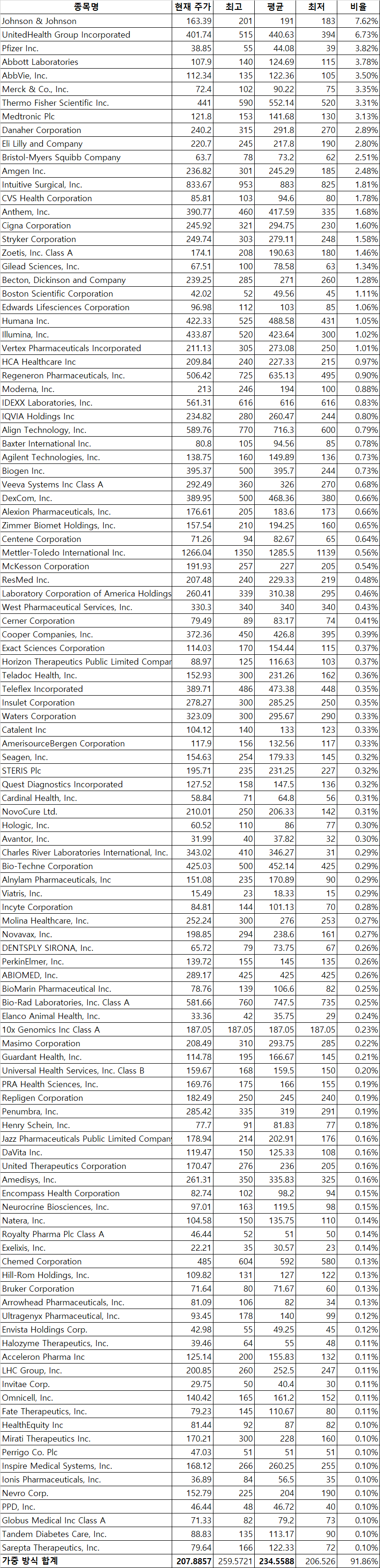 VHT ETF 보유 종목별 목표 주가와 현재 주가 - 21년 06월 09일 기준 <추가>