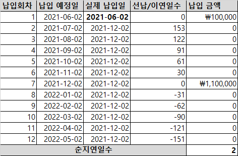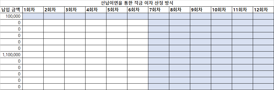 첫 회차때는 가입을 위해 정상적으로 납입을 한 뒤, 7회차(전체 납입 회차/2+1)에 납입해야하는 나머지 금액을 선납한다면, 순지연일수(이연일-선납일)가 최소화 되어 일반 적금보다 높은 이자를 받을 수 있게 됩니다.