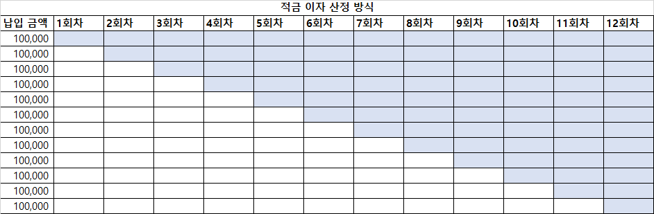 먼저 적금은 첫 회차에만 1년에 대한 이자를 지급해주고 그 이후부터는 남은 기간에 대한 이자만 지급해줍니다.