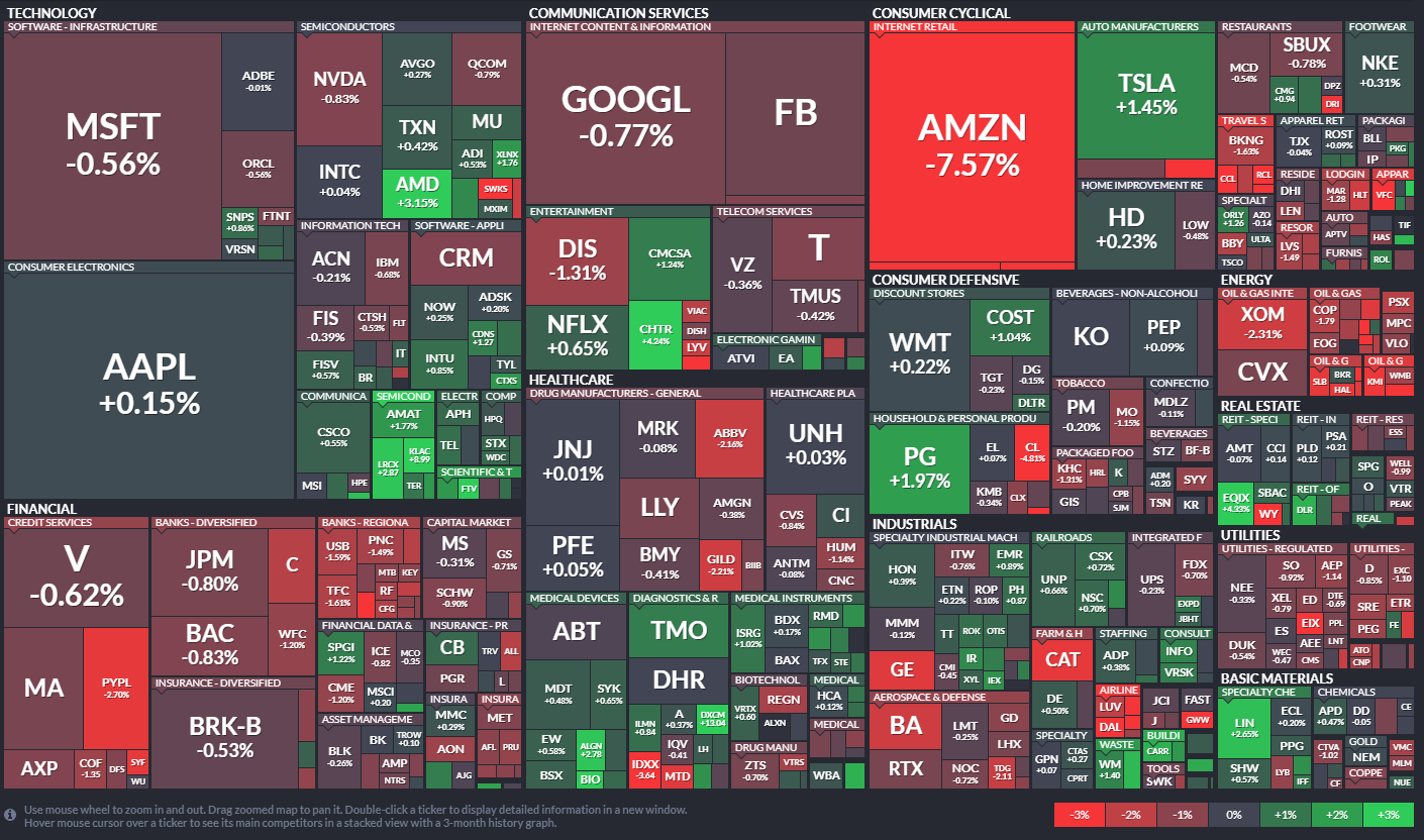 | Amazon (AMZN) | 동사에서 2018년 3분기 이후 처음으로 월가의 매출 전망치를 하회한 뒤, 주가는 6.6% 이상 하락하고 있다. EPS는 월가의 전망치인 12.30달러를 상회한 15.12달러가 나왔다.. |