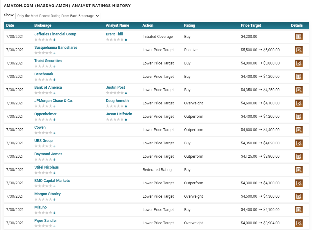 실적 발표 이후 15개의 IB들이 투자 의견을 발표했는데 모두 매수 의견과 함께 현재 주가보다 높은 목표 주가를 제시했습니다. 월가에서 Amazon을 어떻게 생각하고 있는지 볼 수 있는 부분이지 아닐까 싶네요.