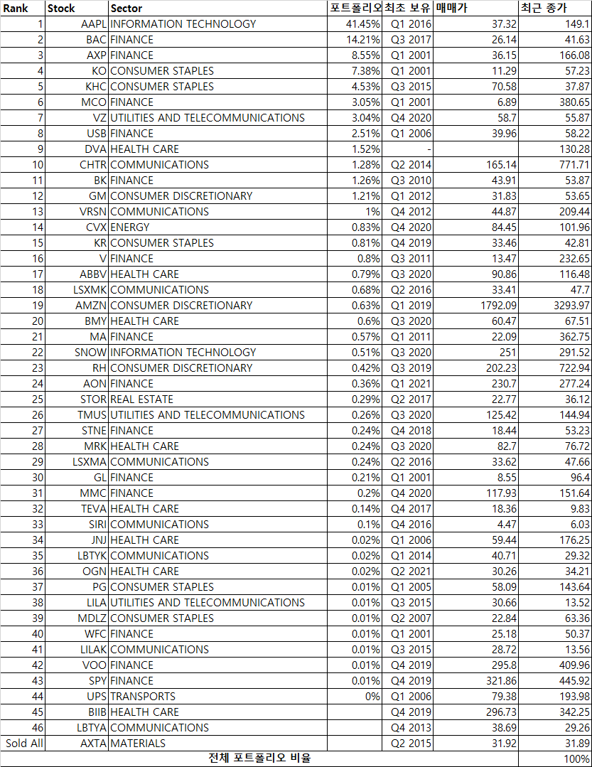 투자 포트폴리오 (21년 06월 31일, 13-F 기준) <추가>