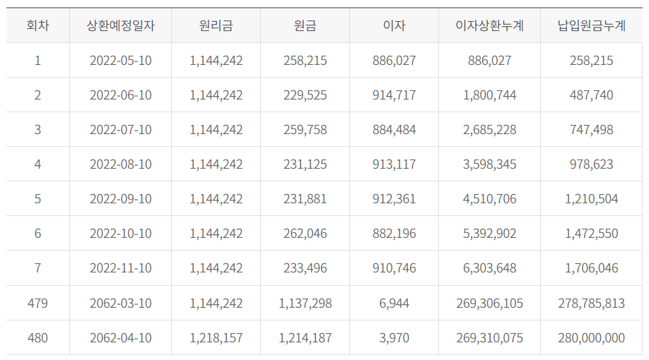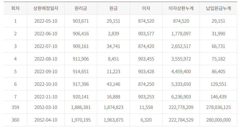 | 구분 (30년) | 첫 달 상환 금액 | 총 이자 상환 금액 |