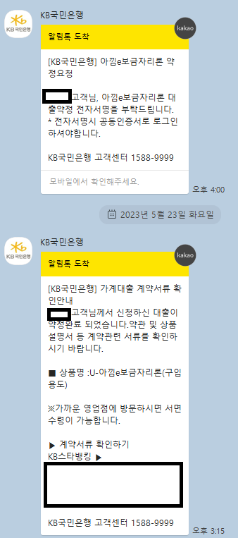 4. 드디어 대출 승인이 통지되었습니다. 이후 은행에서 대출 안내 전화가 왔고 준비 서류를 카톡으로 보내줬습니다.